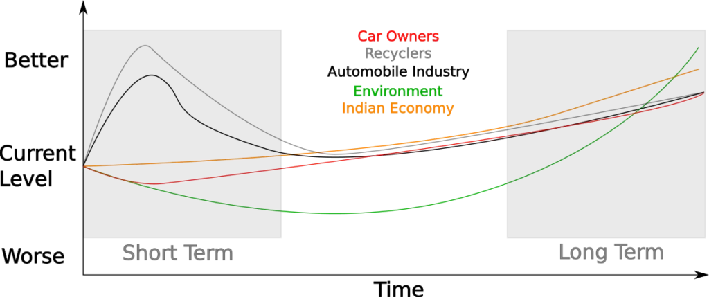 The long term impact of this policy is interesting from an economic perspective. While it will not be the main driver of new car sales, it will play a critical role in the lifecycle of automobiles in India and will greatly contribute to achieving a circular economy in India.